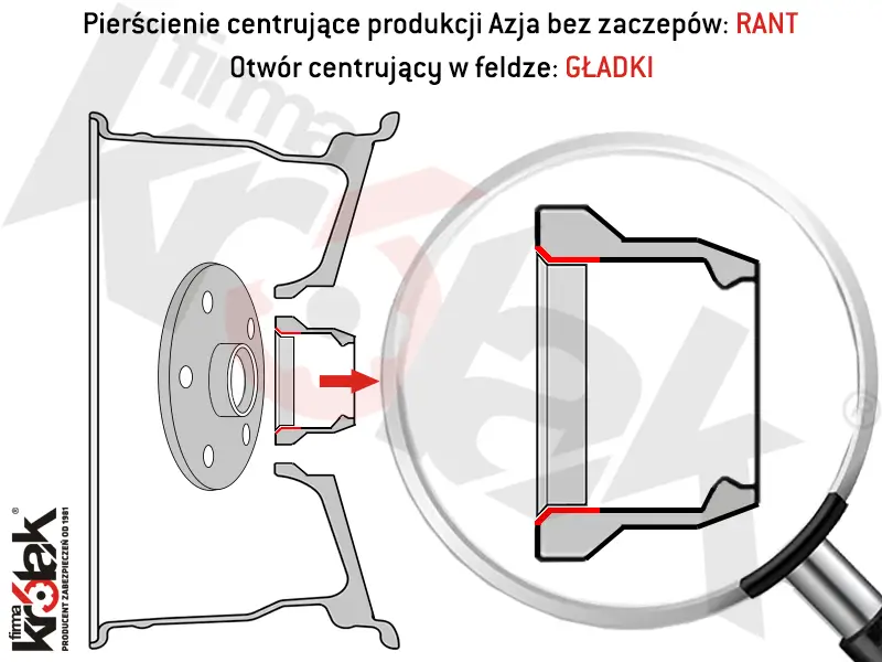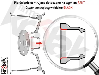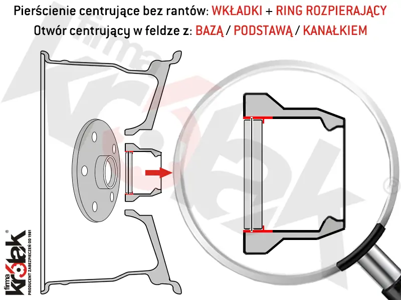 3. Pierścienie centrujące z rantem i zaczepami. Oferowane jako akcesoria fabryczne, dodawane przez producentów Europejskich felg. Pierścienie z tego rodzaju posiadają zaczepy blokujące je przed wypadaniem w trakcie montażu / demontażu kół. Dobranie odpowiednich, ażeby zaczepy spełniały swoją powinność wymaga, poza dobraniem odpowiednich średnic, określenie na jakiej głębokości w otworze centrującym felgi znajduję się stopniowanie, kanałek / rowek, o który zaczepy przy montażu pierścieni się zahaczą.